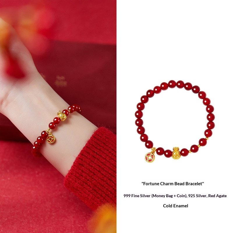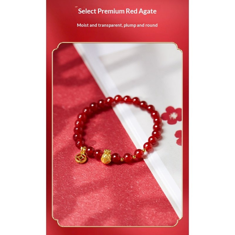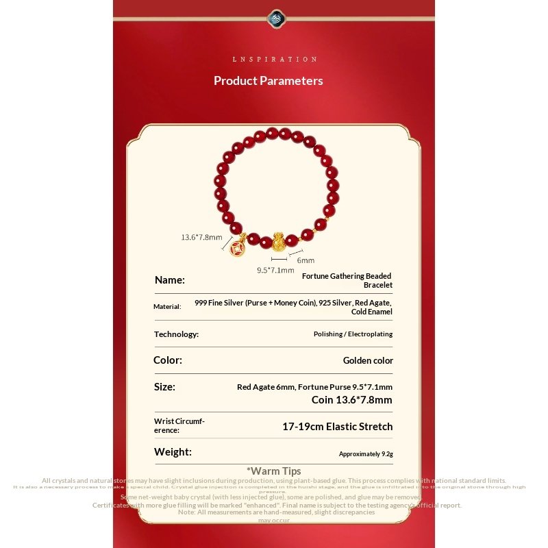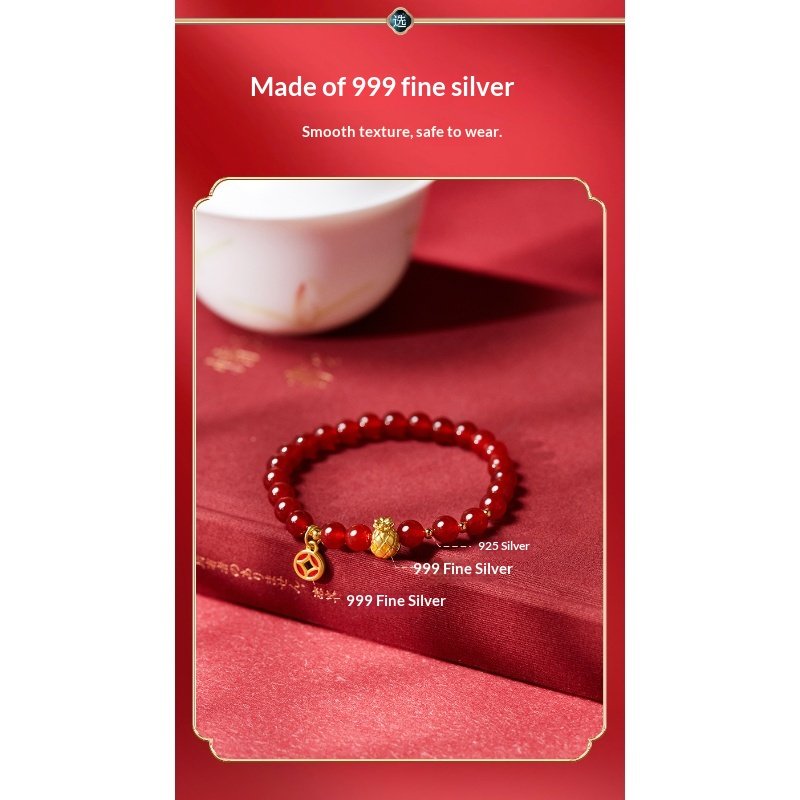 “999 Fine Silver Red Agate Bracelet – Lucky Fortune Bag & Wealth Coin Charms”