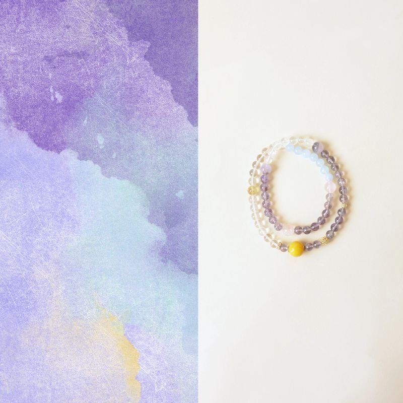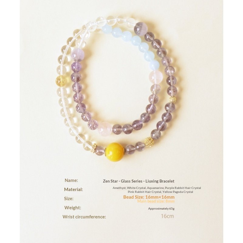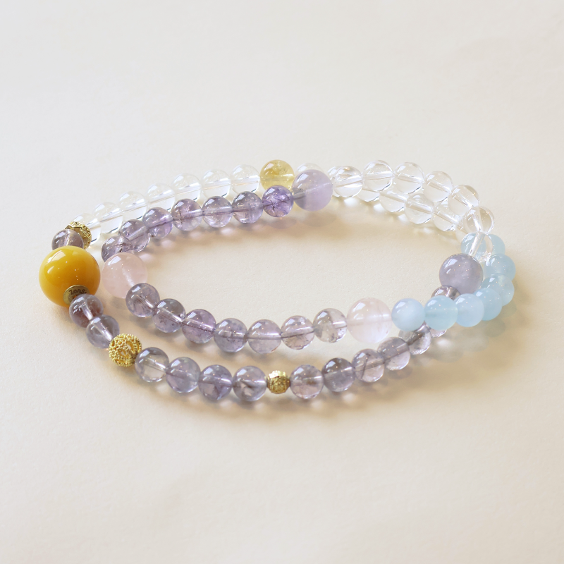 Materials: Amethyst, Clear Quartz, Aquamarine, Purple Rutilated Quartz, Pink Rutilated Quartz, Yellow Tower Crystal