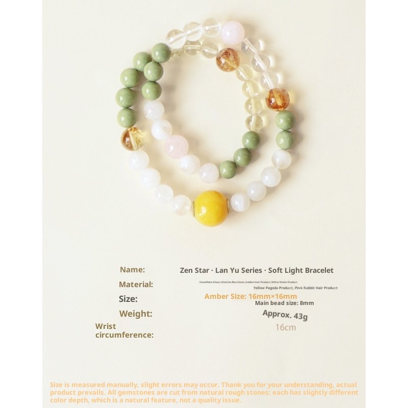 Materials: Snowflake Alabaster, Matcha Alashan Agate, Gold Rutilated Quartz, Clear Quartz, Yellow Phantom Quartz, Pink Rabbit Hair Quartz