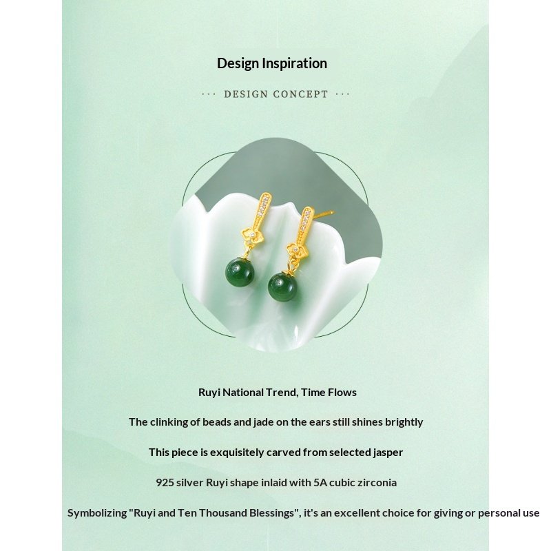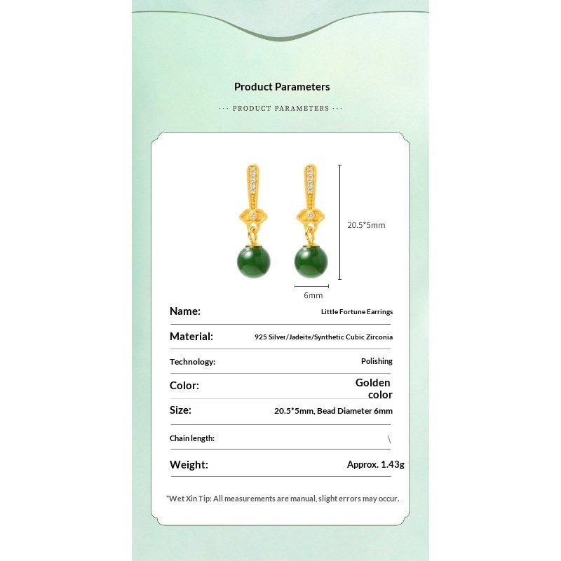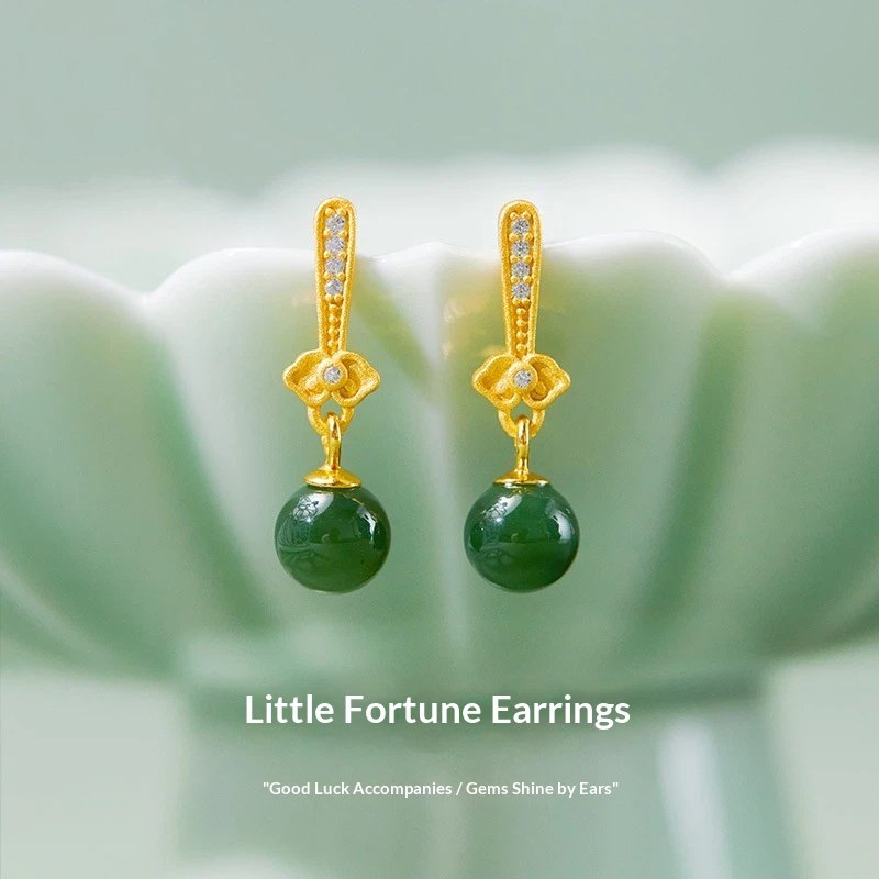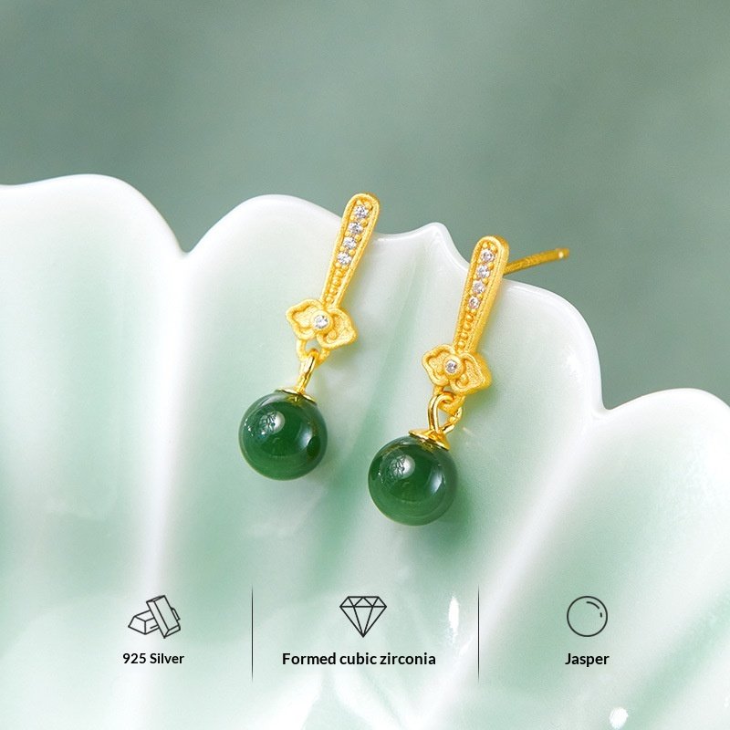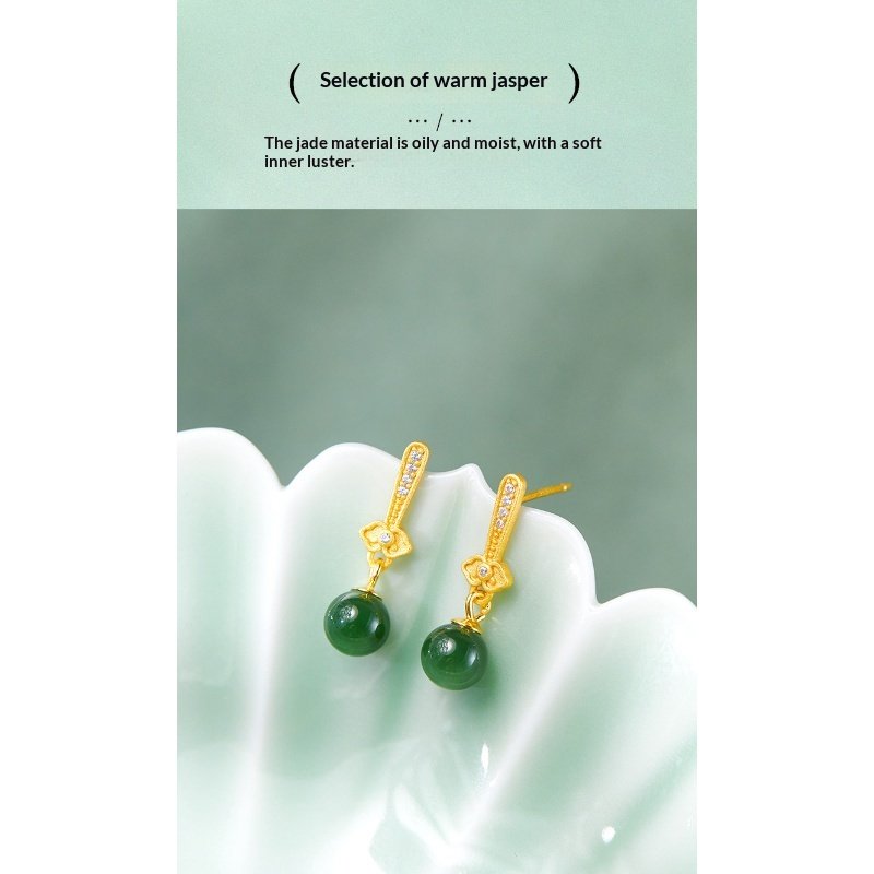 The S925 sterling silver natural Hetian jade biyu round bead earrings are a feminine accessory that combines the texture of natural jade with silver jewelry craftsmanship. Centered around the ’round bead’ design, they feature the lustrous hue of Hetian jade biyu, paired with the delicate texture of S925 sterling silver. Made with S925 sterling silver (some styles use gold plating or micro-setting techniques), they are hypoallergenic. The high purity of S925 sterling silver ensures resistance to oxidation; if oxidation occurs, it can be cleaned and restored to its luster using a silver polishing cloth or toothpaste.