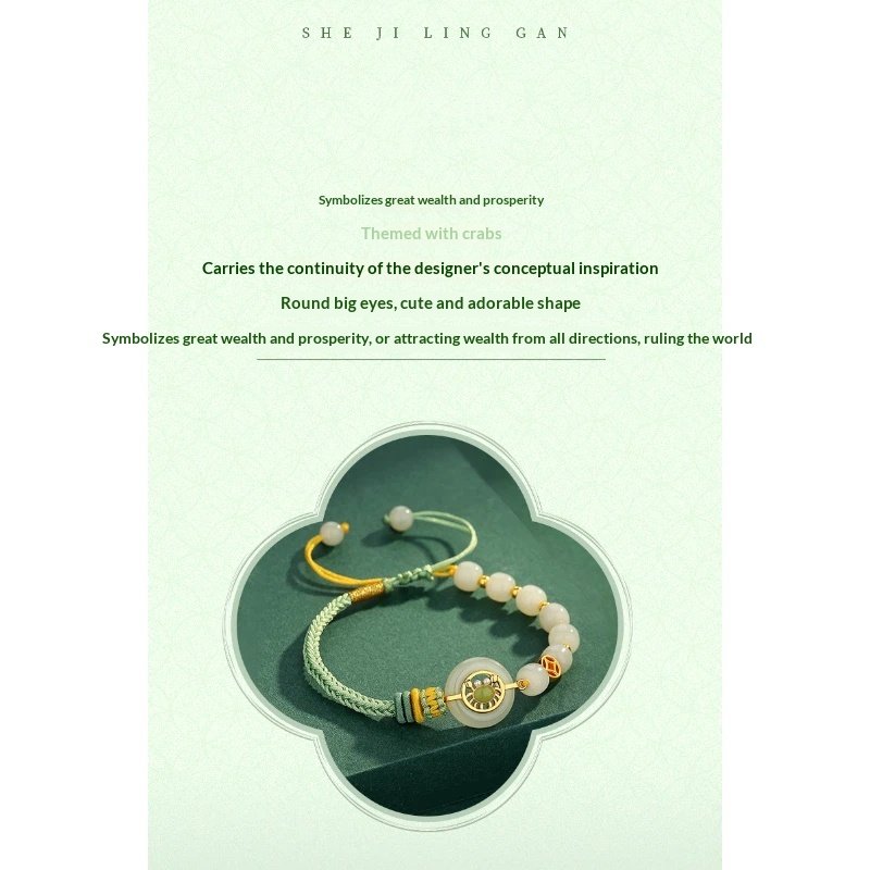 S925 Sterling Silver Eight Directions Bring Wealth Hetian Jade Bracelet, a lightweight luxury gift that attracts wealth and good fortune. Hand-woven with S925 silver and Hetian jade, it symbolizes the gathering of wealth from all eight directions, safeguarding smooth career progress and implying becoming the richest under heaven. Centered around crabs as the theme, it continues the designer’s conceptual inspiration with round, big-eyed, cute and adorableStyle,Implies being extremely wealthy and powerful or bringing wealth from all directions to dominate the world.
