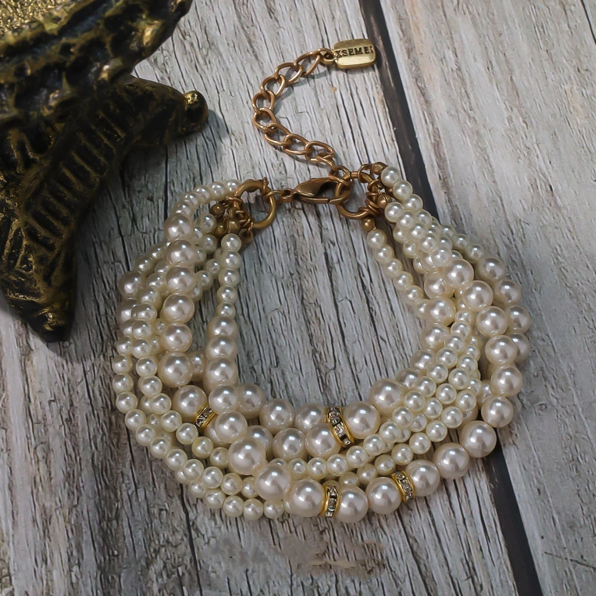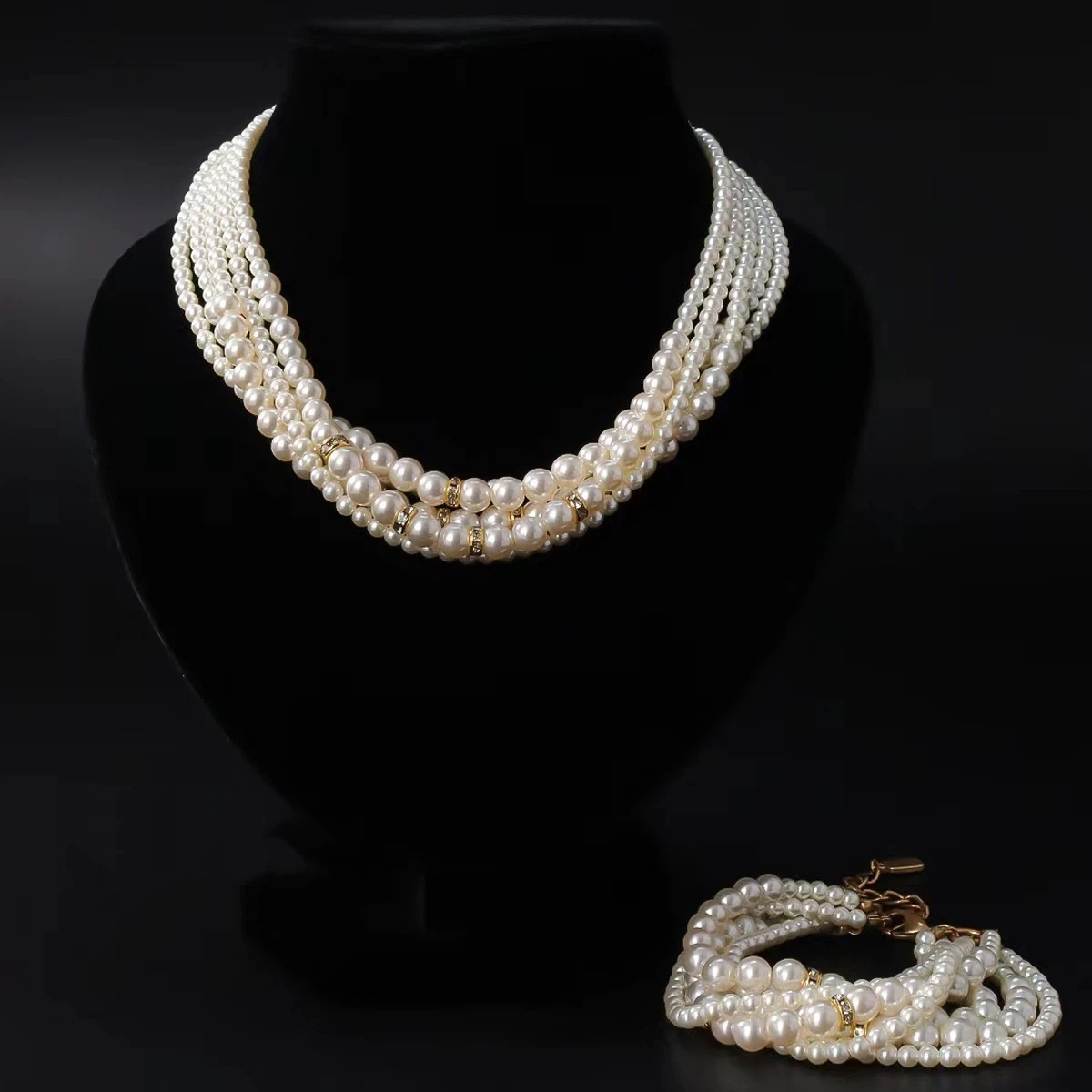 Vintage necklace with high-luster round pearls, multi-layered with diamonds, versatile and stylish, suitable for layering, clavicle pearl necklace set